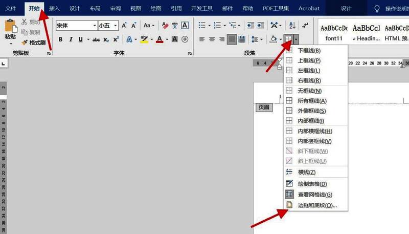 点击“开始”,选择段落框线图标,点击下拉小箭头。点击“边框和底纹”。