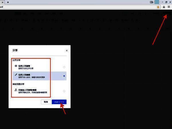 3、接着,点击右上角的分享,设置分享或是多人编范围,选择创建并分享就可以进入共享多人编辑了。