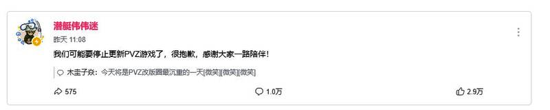 【杂交版】作者“潜艇伟伟迷”:我们可能要停止更新PVZ游戏了,很抱歉,感谢大家一路陪伴!