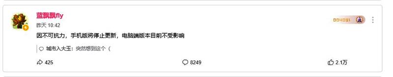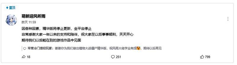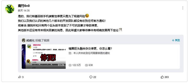 目前,具体停更原因暂不清楚,也没有任何官方对此事表态。有玩家推测可能是为规避风险而采取的临时措施,评论区有网友调侃称:“这是植三大佬出手了!”