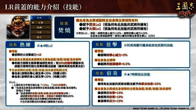 藉由战法赋予新有利变化「击炎」,提升火属性战法的击心威力,能发挥强力的一击。此外,「当主将为孙坚/孙策/孙权/孙尚香」时,透过技能强化孙坚等人的战法,非常适合与孙坚等人一同搭档。