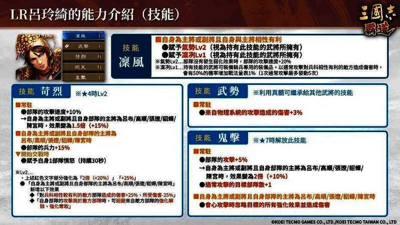 可以使用战法赋予包含自身在内的3个己方部队75%「有利激攻」,能大幅强化自身和我方。同时也很适合担任副将,「当吕玲绮为副将且主将为吕布/高顺/张辽/貂蝉/陈宫」开始交战时,可发挥赋予有利变化「愤怒」等多项强力的效果。