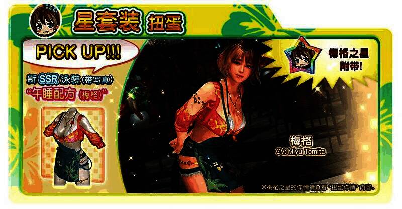 「梅格」可以于今日开始的「星星穿搭抽卡」中获得新 SSR 泳装「午休特调」后招待至岛上。使用付费 V 心石抽卡将可额外获得「梅格星星」,只要收集 200 个「梅格星星」即可兑换一套「梅格」专用 SSR 泳装。
