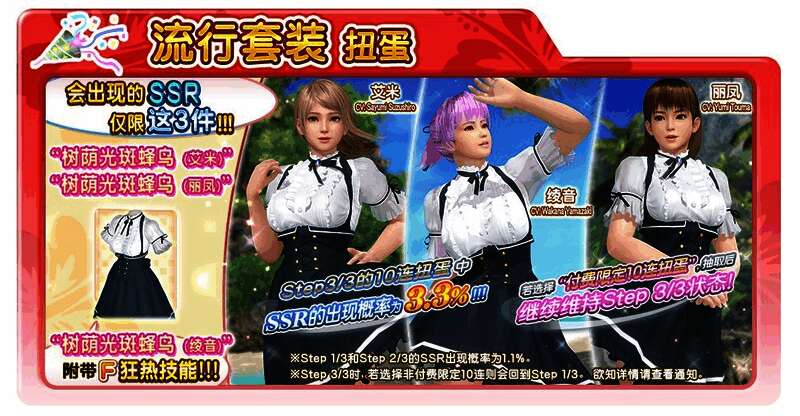 登场的SSR泳装仅限以下的「树荫光斑蜂鸟」。于Step3/3进行10 连抽卡时,SSR的出现机率为3.3%。
