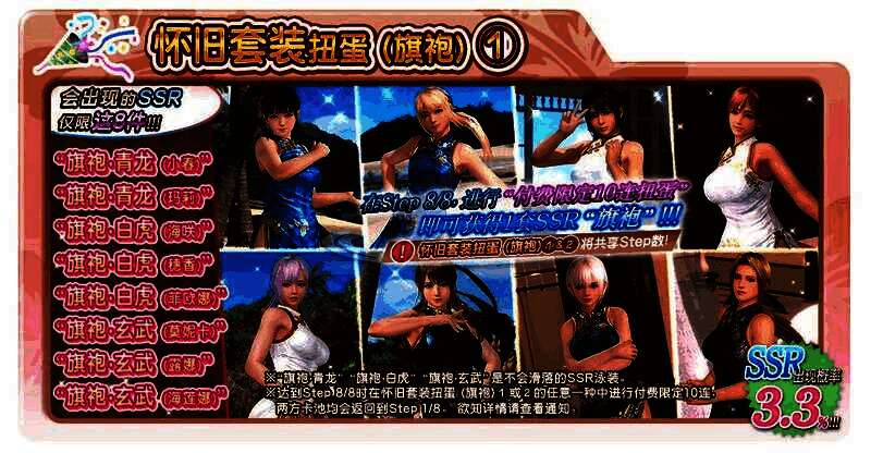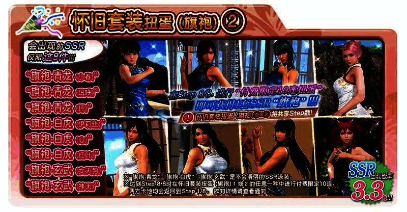 登场的SSR泳装为「旗袍・青龙」「旗袍・白虎」「旗袍・玄武」之一,SSR的出现机率为3.3%。