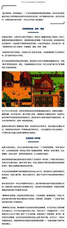 近日新华社主办时政期刊《半月谈》发表文章,就年轻人当下对于模拟经营游戏《星露谷物语》的着迷进行了独家分析。