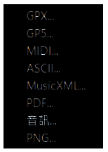 1、当我们要导出总谱时,需要选择除“音频”以外的文件格式,如PNG图片格式,PDF的文档格式,以及MusicXML压缩乐谱文件。导出格式有:GPX...等。