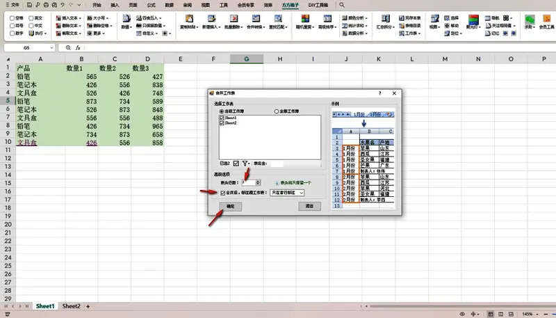 4、这时在打开的窗口中,我们需要勾选需要合并的工作表,再在“表头行数”的框中输入“1”,然后将“合并后,标注源工作表”选项勾选上,点击“确定”。