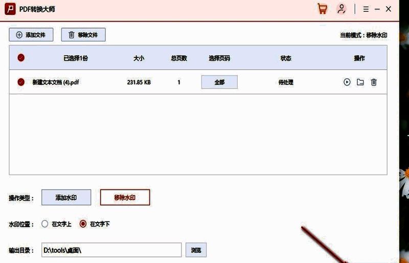 6、最后设置好输出保存位置之后,点击界面右下角的这个开始按钮就可以开始转换PDF文件水印的操作了,等待转换完成即可。