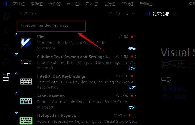 3.接着,在打开的扩展商店栏目中,输入@recommended:keymaps进行查找