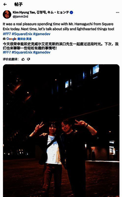 金亨泰在贴文中表示:“今天能与Square Enix的滨口先生共度时光非常愉快。下次我们也来聊点轻松好玩的事吧!”并附上两人合影照片。滨口直树随后也发文确认会面,称“从创意指导到市场宣传,双方进行了多方面的交流”,并对此次机会表达感谢。