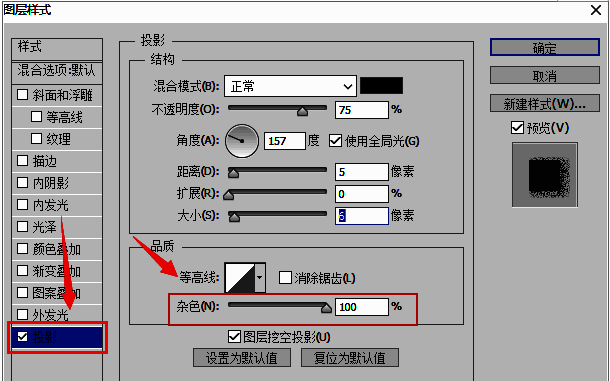 4.最后,在打开的投影面板中将杂色滑块移动到100%位置即可