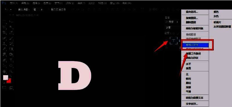 3.接着,在图层面板中选中文字图层,右键点击栅格化文字按钮