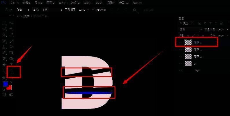 5.最后,新建一个空白图层3,在文字切割处用椭圆形状工具绘制蓝色切割面进行添加,并按下键盘的Ctrl+T键使平面吻合即可
