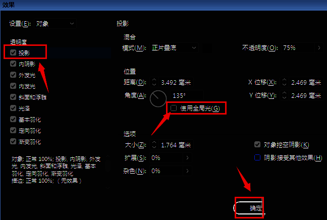 3.最后,在投影板块中勾选使用全局光按钮,点击确定保存即可
