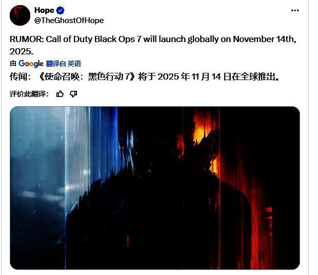 近日,据知名《使命召唤》系列爆料人GhostofHope透露,系列新作《使命召唤:黑色行动 7》可能将打破传统,将于2025年11月14日(星期五)正式发售。若消息属实,这将比其前作《黑色行动 6》(2024年10月25日发售)的发售日晚约三周。