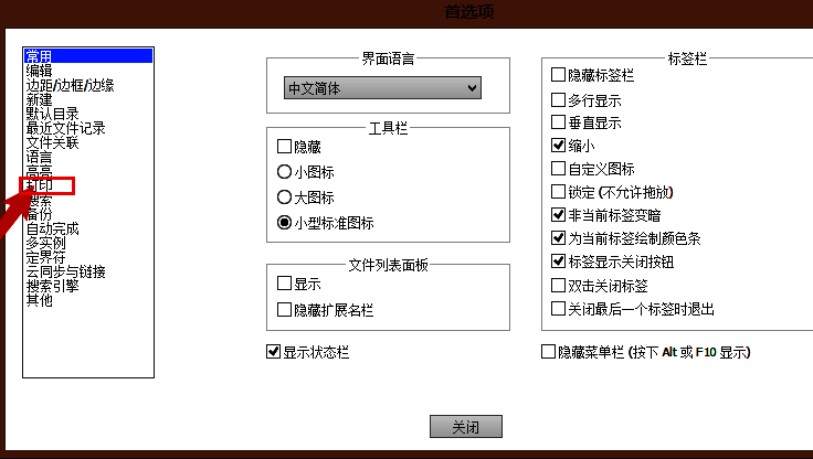 2.随后,在首选项窗口中找到打印栏目
