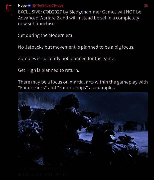 常常爆料COD消息的舅舅TheGhostofHope在社交媒体上称,2027年的《使命召唤》游戏不是《高级战争2》,相反将引入一个全新的子系列。该作设定在现代,没有喷气背包,但移动将是一大关注点,《现代战争3》跑酷地图Get High地图将回归。没有僵尸模式。