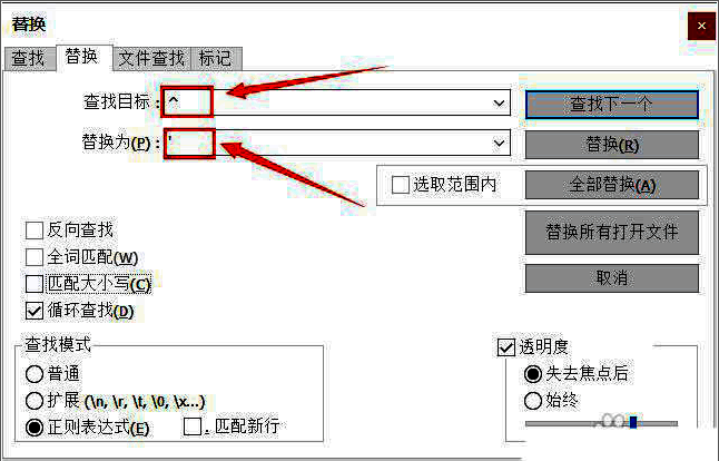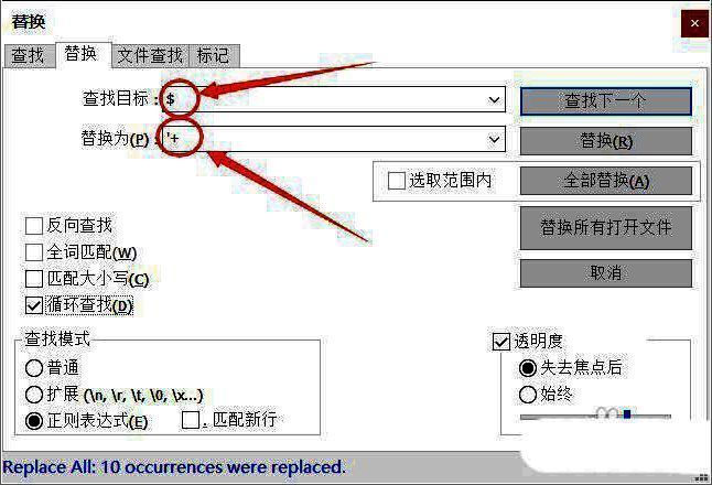 4.同样尾段也是同样步骤,把查找目标改为$,替换目标改为'+即可