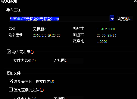 2、点击文件菜单,单击“导入序列”,在弹出的“导入序列”对话框中,点击浏览,找到原先的那个工程文件,之后点击确定;