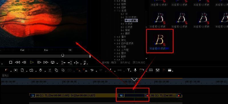第四步,将小波浪特效拖拽到两个视频素材的相接位置