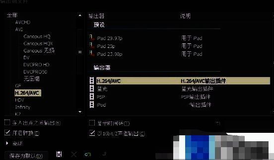 4、最后调节输出设置,输出器选择 “-H.264/AVC”输出 。