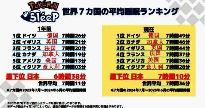 ·根据《宝可梦 Sleep》的实际游戏数据显示,目前主要发行的7个国家中,始终稳居倒数第一的日本已经由1年前的平均6小时38分提升到了7小时10分,虽然提升显著,可惜竞争对手们同样提升不少,仍然位居最末尾。