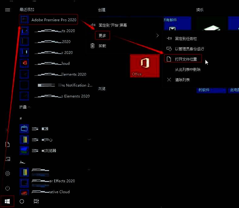 点击电脑左下方的开始,在最近添加里面找到Adobe Premiere Pro 2020软件图标,用鼠标右键单击,更多里面,点击打开文件位置;