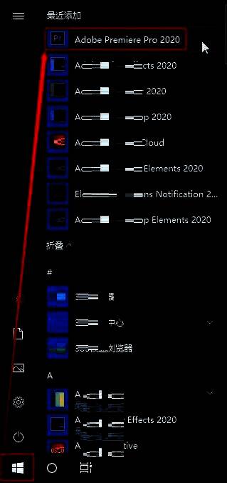 也可以点击电脑左下方的开始,在最近添加里面,点击Adobe Premiere Pro 2020软件图标,打开软件;