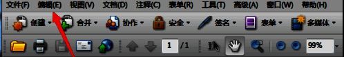进入到了Adobe Acrobat 9 Pro的点击菜单中的 编辑 的菜单。