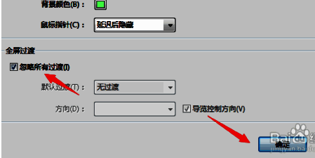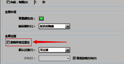 选中了全屏的选项之后,勾选上 忽略所有过渡 的选项。