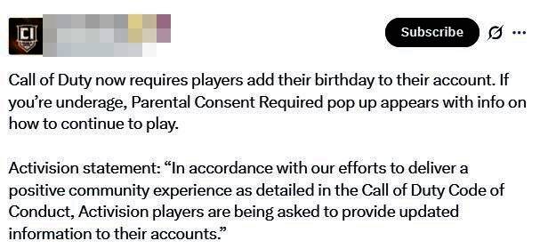 据外国网友在社交媒体上发现,玩家现在需要在其动视 (Activision) 账户中添加生日信息。任何未成年玩家将需要获得家长同意,否则账号可能面临被删除的风险。