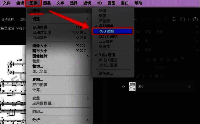 然后,点击上方菜单栏中的【图像--模式--RGB颜色】