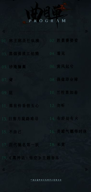此前音乐会曲目单包括《称王称圣任纵横》《胜景赛婆娑》《看见》《屁》《聋》《黑神话:悟空主题音乐》等,不知本次的曲目名单又有多豪华呢?敬请期待本次音乐会的到来吧!