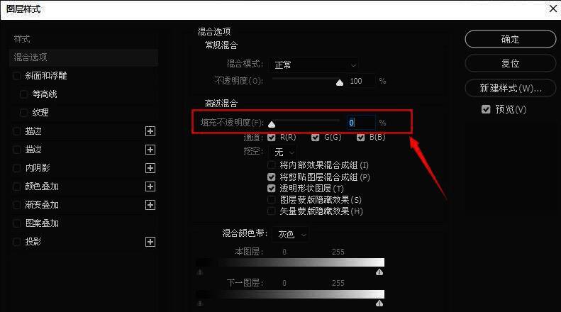 接着,在图层样式里面,把填充不透明度设置为【0】%。