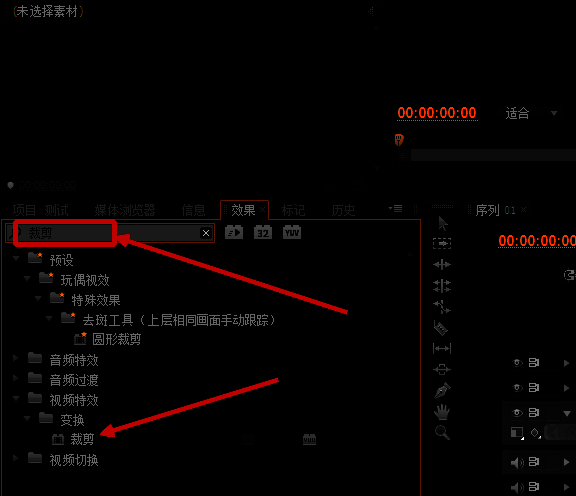 这里有一个搜索框,在这里搜索一个“裁剪”特效,如图,搜索到了。