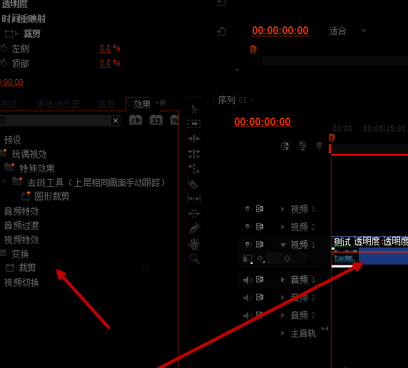 接着我们把“裁剪”特效拉到视频上面(用鼠标拖过去)。