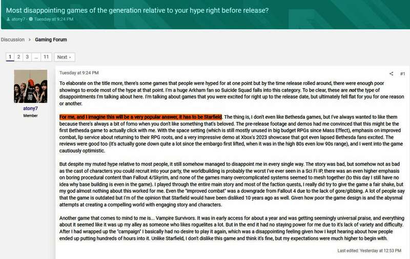在ResetEra的一个讨论帖中,玩家们被要求列出“本世代最令人失望、最不符合预期的游戏”,《星空》毫无悬念地位居第一。这表明这款游戏未能达到预期目标。