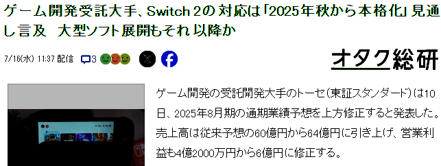 任天堂新主机目前销量走势良好,但是不可忽视的是第三方游戏大作支持依然不足,日前根据一家日本最大委托游戏开发商新财报暗示,Switch 2或将于今秋大作发力。