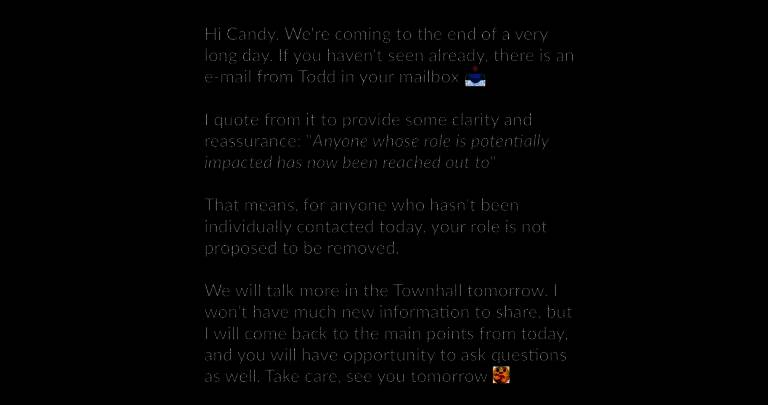 裁员当天,通过Slack平台向全体《糖果传奇》员工发送的消息。