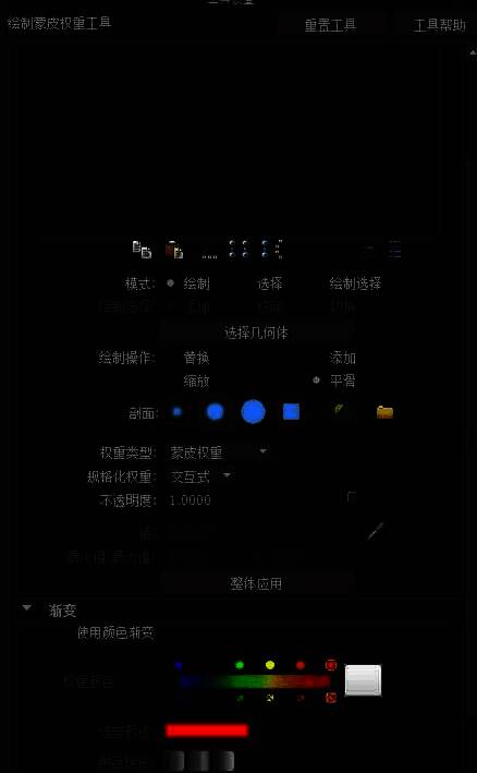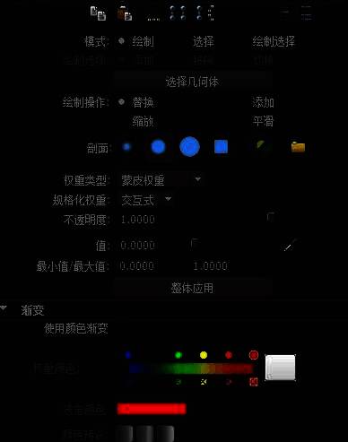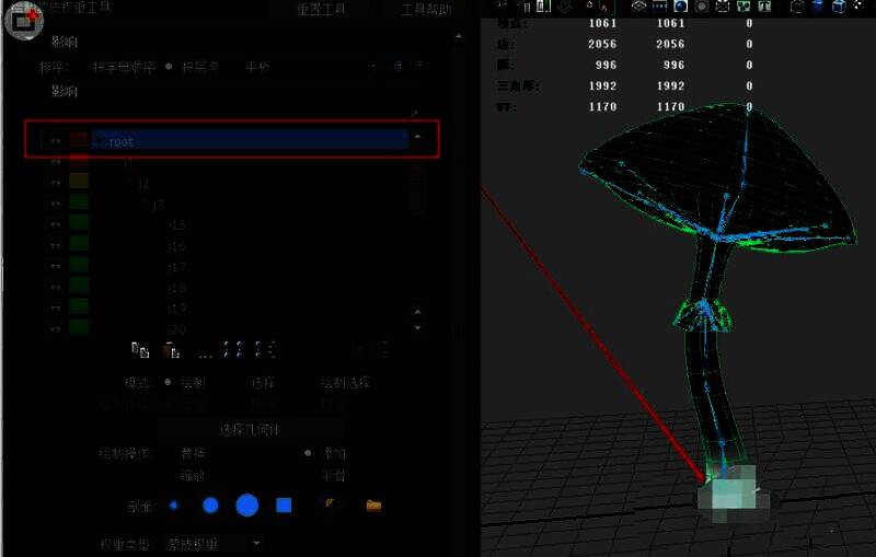 通过以上操作,选择root——j21等骨骼,绘制权重。绘制时多使用平滑过渡。使用添加模式时,值设置偏小;替换模式中,设置值为0