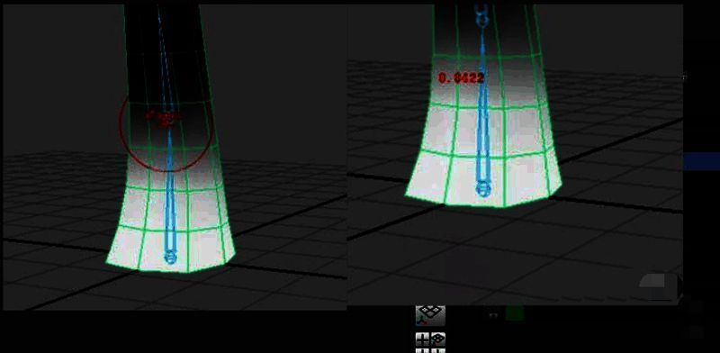 当选择需刷权重的模型时,属性栏中上方的方框中会显示模型对应蒙皮的骨骼。点击任意骨骼,在模型中会对应显示骨骼所控制的模型;如图,选择每根骨骼查看对应的蒙皮范围,并通过刷子来调整。