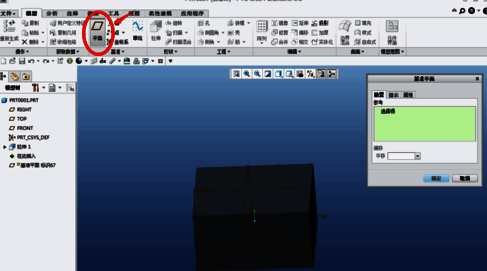 在基准平面的设置窗口中选择长方体的上表面作为第一个参考平面;