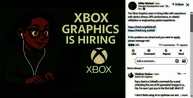 一波未平一波又起,微软裁员风波刚刚过去不久,xbox图形部门又搞骚操作。 Xbox图形部门首席开发主管迈克·马特塞尔(Mike Matsel)在领英上发布了一则新的招聘信息,其中包含一张明显是AI生成的图片,引发众多网友嘲讽。