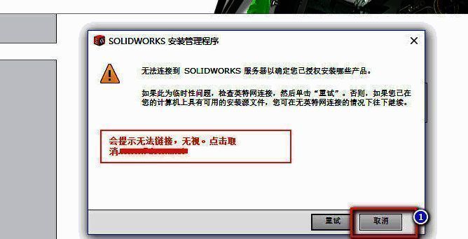 7、然后安装界面会提示“无法连接到Solidworks服务器...”在这里选择“取消”.如下图