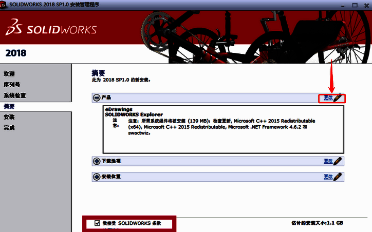 8、当出现界面之后,不要忙着去点击现在安装:点击更改,然后选择SolidWorks和语言-简体中文,这一步比较重要!