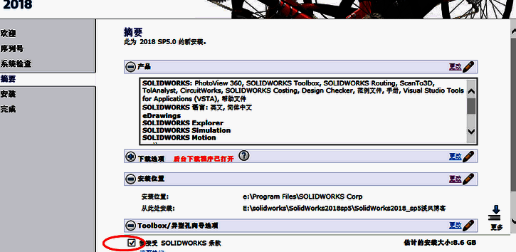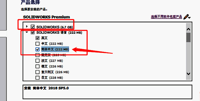 10、溪风老师提醒,这一部非常的重要,必选的是SolidWorks(这个是主文件),然后就是语言-选择简体中文。(很多SolidWorks新手安装完发现是英文版的,就是因为这里没有选择)其他插件根据自己的需要选择即可,选完之后点击右下角的返回摘要