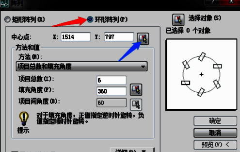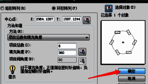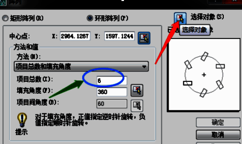 5、自动弹出对话框,改项目总数为6,单击选择对象图标,选五边形,按空格或回车键确定,对话框中单击确定。