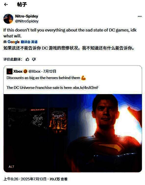随着新一部《超人》电影全球热映,首周末票房预计将突破1.2亿美元,华纳兄弟和DC也试图借此热度推广自家游戏产品。近期,多款DC相关游戏在Xbox平台推出促销活动,其中包括《蝙蝠侠:阿卡姆合集》《自杀小队:杀死正义联盟》和《哥谭骑士》。Steam平台也同步提供折扣,PlayStation方面则仅有《哥谭骑士》参与活动。