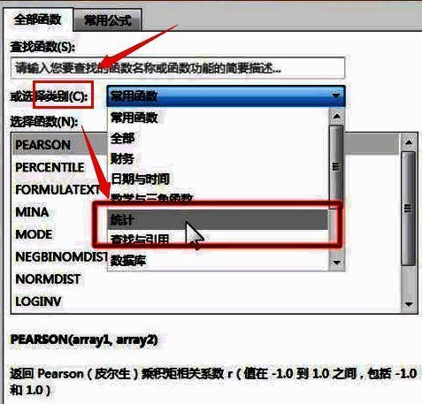3.在打开的函数下拉列表中,将类别更改为统计